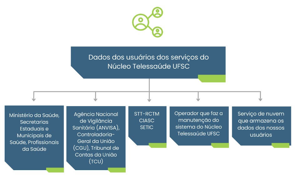 Os dados pessoais e dados pessoais sensíveis do usuário poderão ser compartilhados com pessoas ou instituições públicas, como: Ministério da Saúde, Secretarias Estaduais e Municipais de Saúde, Profissionais da Saúde, Agência Nacional de Vigilância Sanitária (ANVISA), Controladoria-Geral da União (CGU), Tribunal de Contas da União (TCU), Operador que faz a manutenção do sistema do Núcleo Saúde Digital UFSC e o serviço de nuvem que armazena os dados dos nossos usuários.