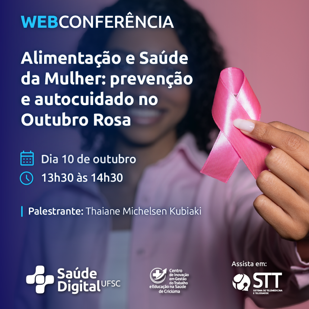 A webpalestra “Alimentação e saúde da mulher: prevenção e autocuidado no Outubro Rosa” será realizada com a participação de Thaiane Michelsen Kubiaki, nutricionista com especialização em nutrição em doenças crônicas.