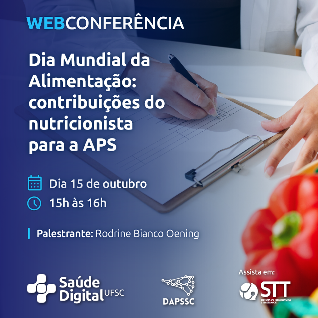 Nesta quarta-feira (15), o tema da nossa webpalestra será “Dia Mundial da Alimentação: contribuições do nutricionista para a APS”. Na atividade será discutida a relevância das ações de alimentação e nutrição na Atenção Primária à Saúde, destacando o trabalho dos nutricionistas no incentivo a práticas alimentares saudáveis e no cuidado integral dos agravos relacionados à alimentação. Compartilhe o convite, conecte-se na data e horário marcados, e participe para tirar suas dúvidas com a palestrante convidada.