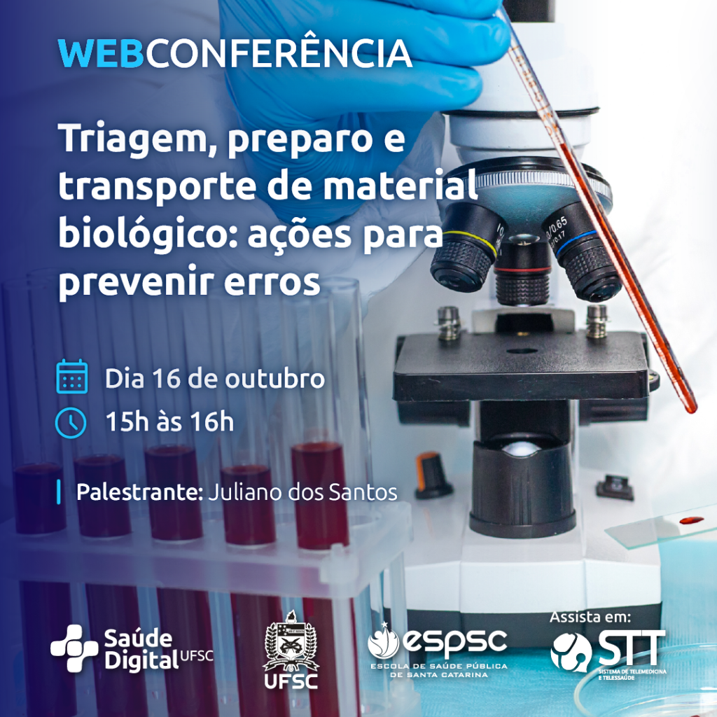 A webpalestra “Triagem, preparo e transporte de material biológico: ações para prevenir erros” será realizada com a participação de Juliano dos Santos, farmacêutico bioquímico e servidor público no setor de Triagem do Laboratório do Hospital Universitário da UFSC.