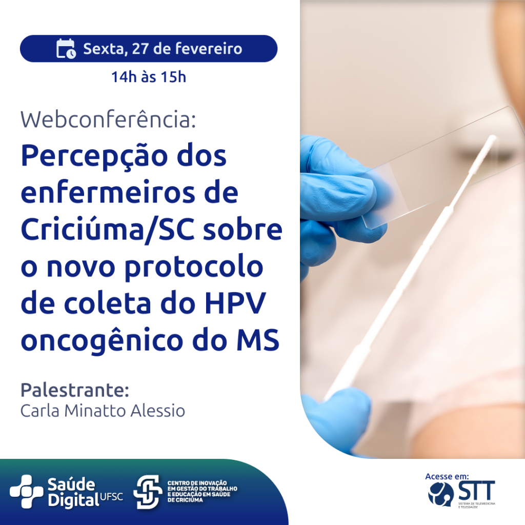 A webpalestra Percepção dos enfermeiros de Criciúma/SC sobre o novo protocolo de coleta do HPV oncogênico do MS” será realizada com a participação de Carla Minatto Alessio, enfermeira e Agente Comunitária de Saúde no município de Criciúma.
