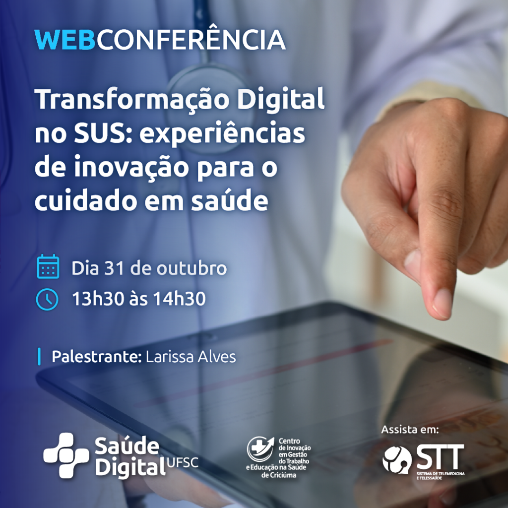 Nesta sexta-feira (31), o Saúde Digital UFSC apresentará a webpalestra “Transformação Digital no SUS: experiências de inovação para o cuidado em saúde“. Na atividade será apresentada a experiência de incorporação de tecnologias à saúde pública de Criciúma (SC), com destaque para o uso da telessaúde, da inteligência artificial e de plataformas digitais. Compartilhe o convite, conecte-se na data e horário marcados, e participe para tirar suas dúvidas com a palestrante convidada.