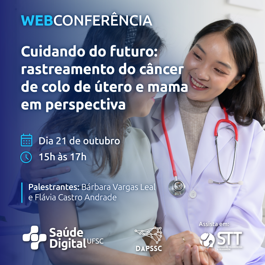 Nesta terça-feira (21), o Saúde Digital UFSC transmitirá o webseminário “Cuidando do futuro: rastreamento do câncer de colo de útero e mama em perspectiva“. A atividade destacará a importância de ações na prevenção e no diagnóstico precoce, abordando os exames recomendados, a vacinação contra o HPV e o papel dos profissionais de saúde em garantir acesso, orientação e acompanhamento adequados. Compartilhe o convite, conecte-se na data e horário marcados, e participe para tirar suas dúvidas com as palestrantes convidadas.